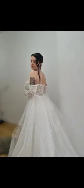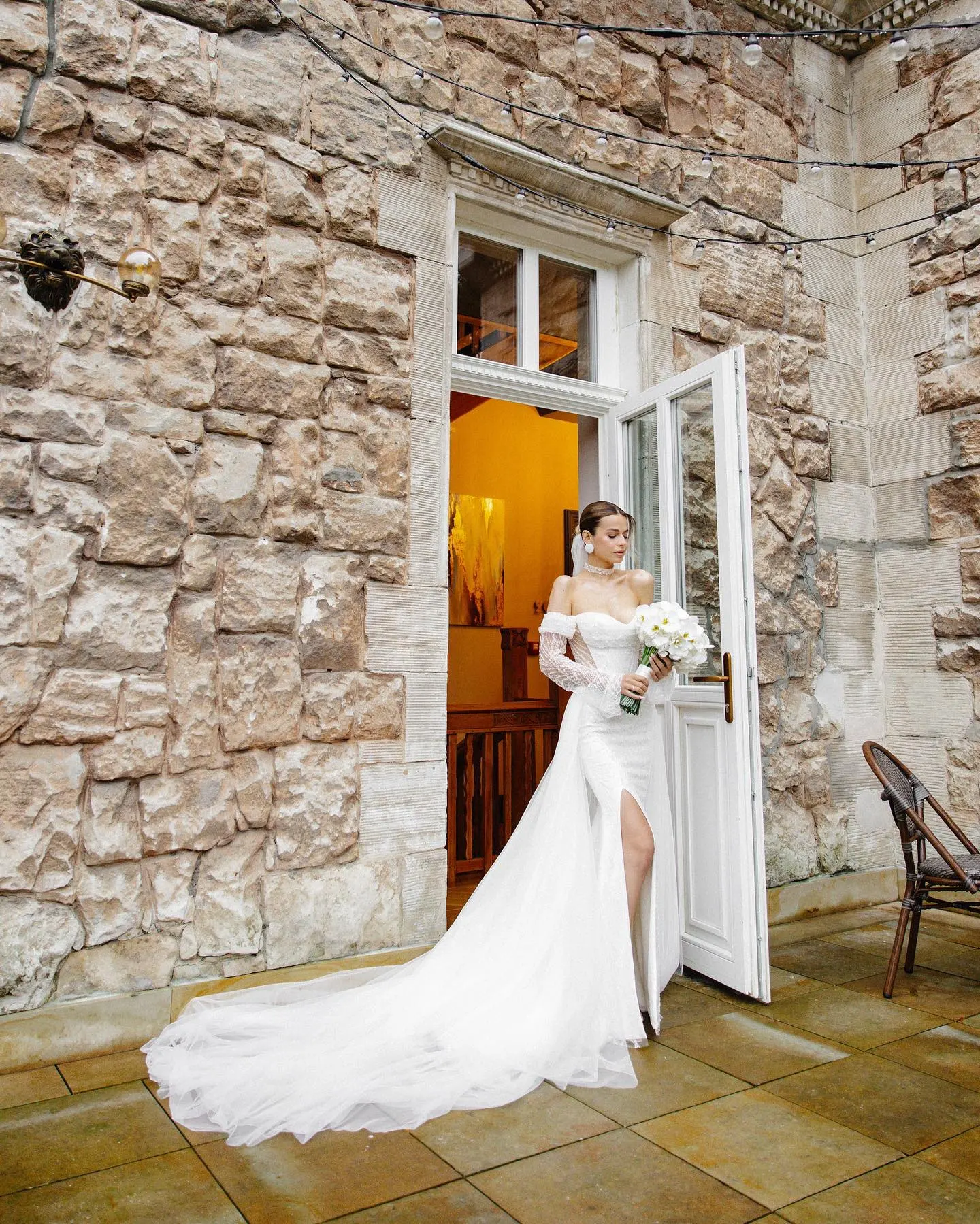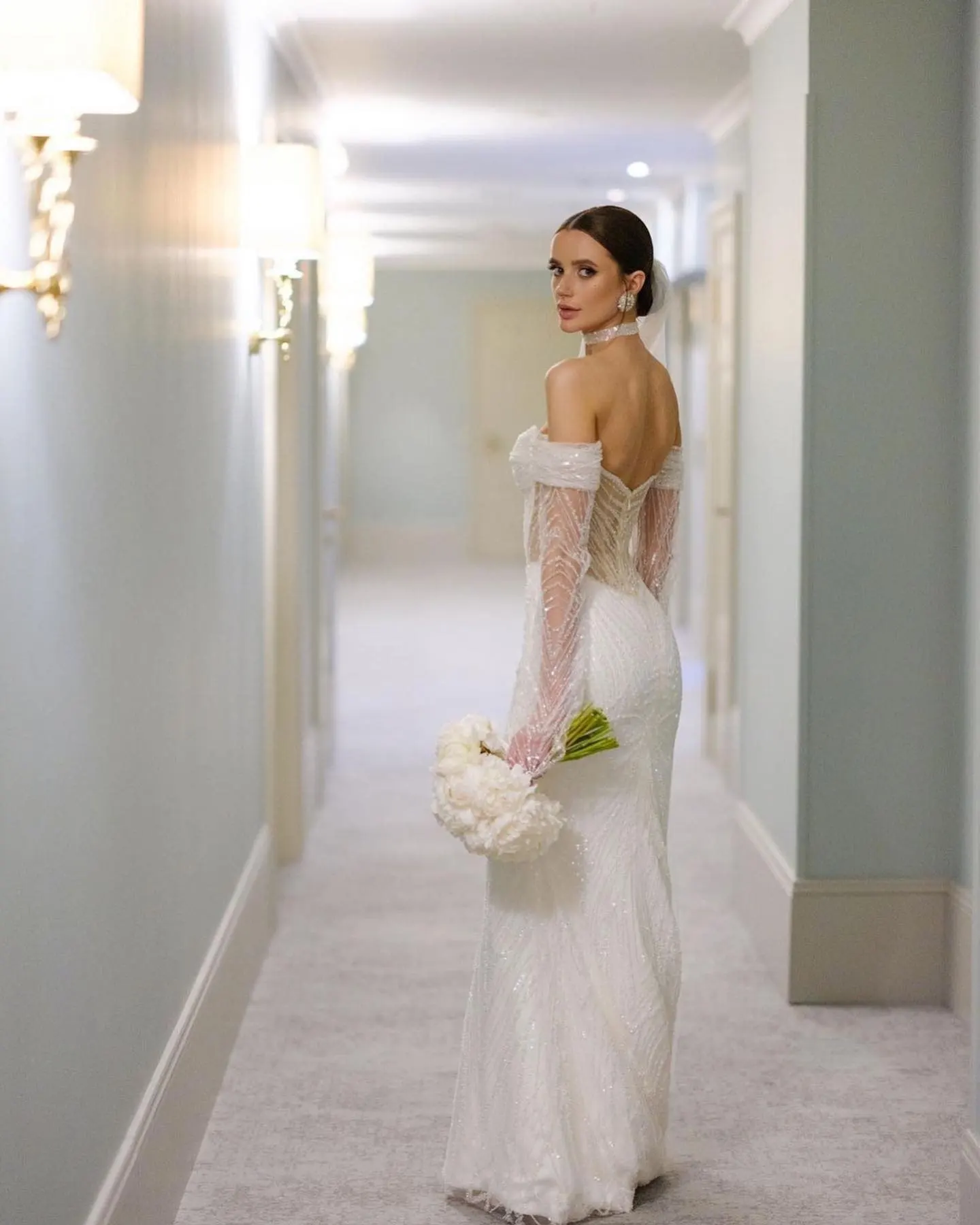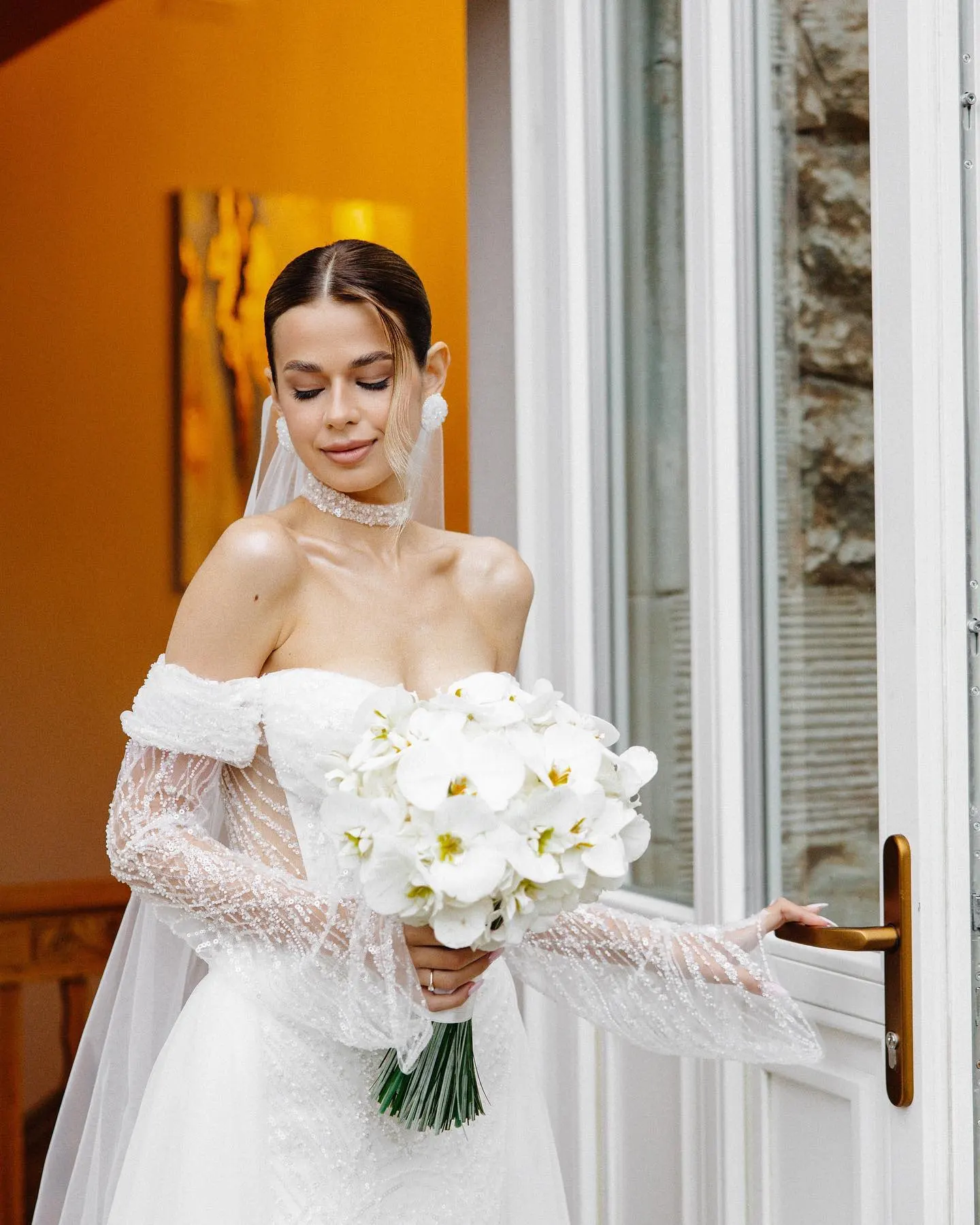 Off - shoulder mermaid wedding dress with sheer sleeves. Find your dream gown at Howedding—shop now!